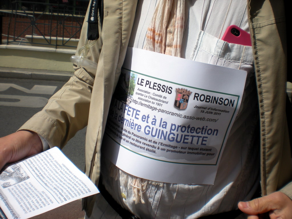 Nous avions décidé ce jour là de tracter pour la déffense du Panoramic et de l’Ermitage. En effet alors que la ville investirait dans cette fête plus de 700 000 € (35 M€ en 50 ans) entre les frais directs (factures directement liéés à la fête) et indirects (disponibilité des services municipaux, police municipale, communication), il aurait été dommage de ne pas rappeler aux Robinsonnaises et Robinsonnais que la dernière guinguette allait être détruite. Oui le Maire avait promis de la faire restaurer, maintenant il l’appelle la vérue. ALors pourquoi l’avoir acheté avec nos impôts 4 Millions d’€, alors qu’un musée du chocolat (commerçant bien connu de Sceaux souhaitait se porter acquéreur) devait voir le jour. On nous a promis une maison de la nature et une salle communale, alors que maintenant on veut le brader à un copain promoteur immobilier à 1 M€.